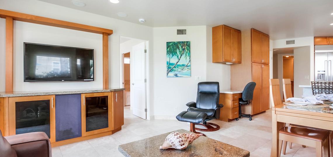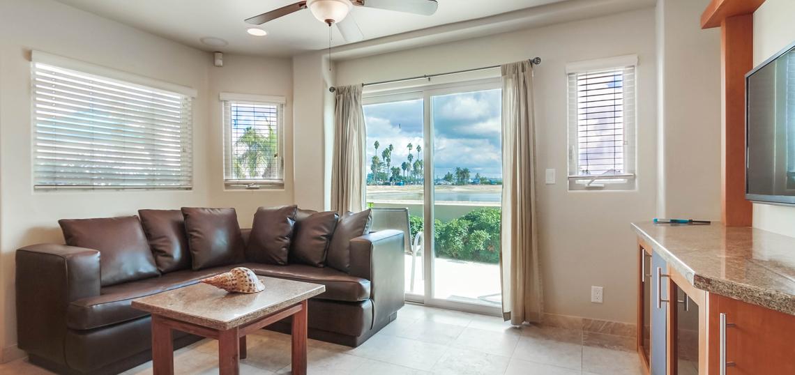 Inside this modern apartment as well as a large living and kitchen area leading onto the patio comes 3 bedrooms; the master bedroom with its King sized bed is en-suite and looks out onto the bay with sliding doors leading out onto the patio area, the second bedroom is a Queen sized bed with an en-suite and the 3rd twin bedroom has an ample closet space and a 3rd bathroom that is off the hallway.